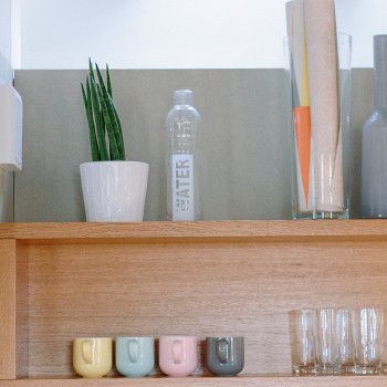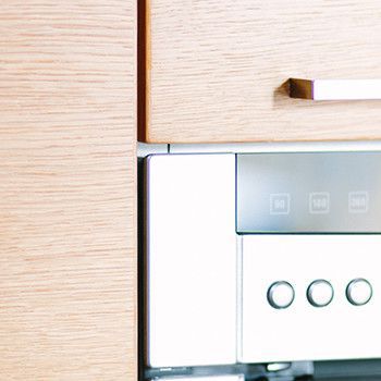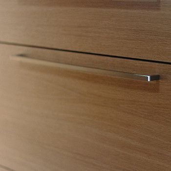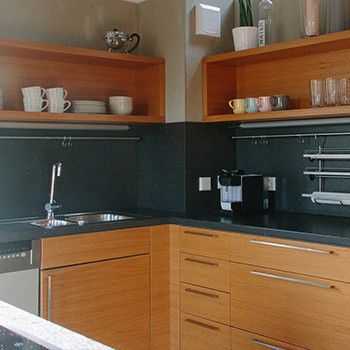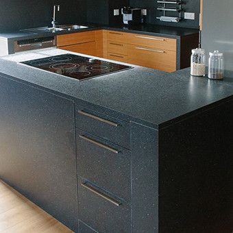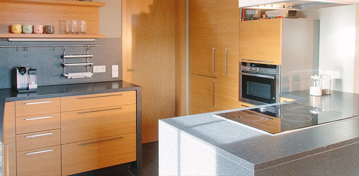In Eiche mit schwarzer Arbeitsplatte.