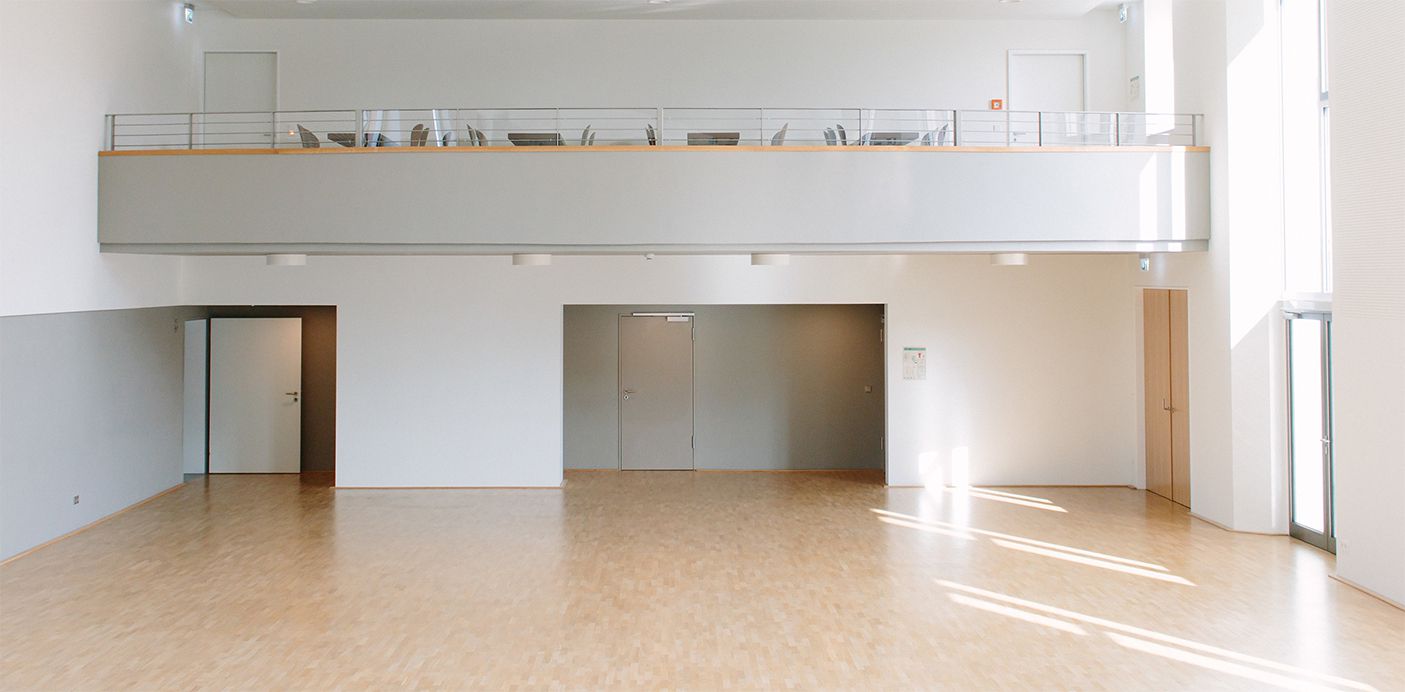 Innenausbau Stadthalle Hilsbach in Eiche und Schichtstoff (matt).